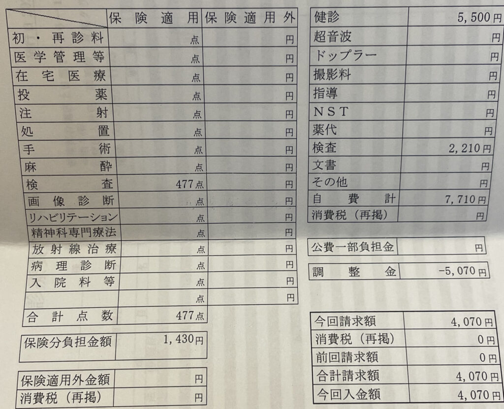 保険適用の477点は、別紙の明細を見たら経腹エコーでした。(今更ですが)