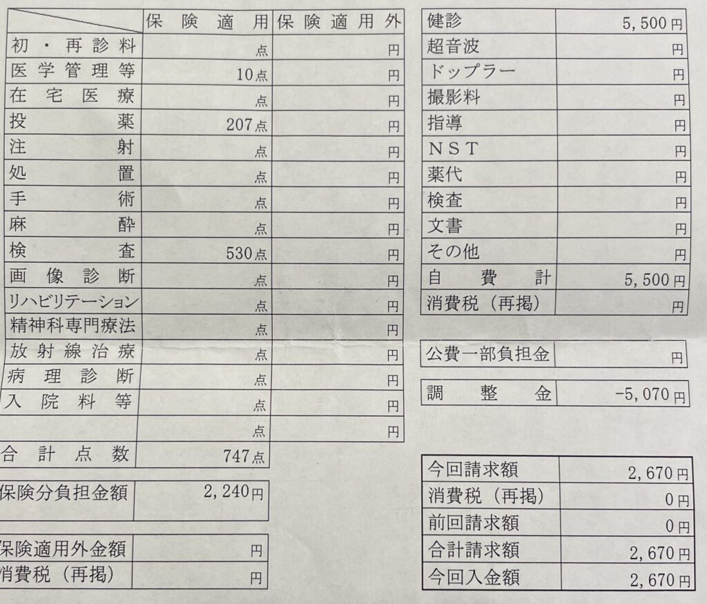 任意の経腹エコーを希望したのと、花粉症のお薬代も含まれています。